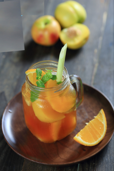 Cho nước cam, nước sả, trà đen vào bình khuấy đều, sau đó rót ra ly, cho đào và đá lạnh vào. Trang trí thêm cam xắt lát và sả cây, lá bạc hà nếu thích giúp thơm phần lôi cuốn.