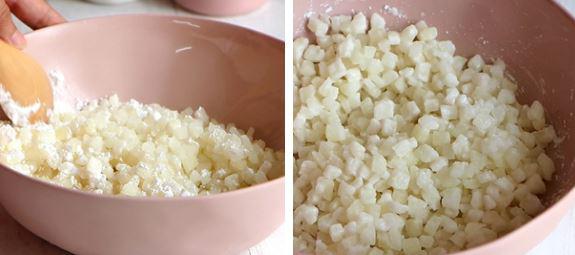 – Sau khi cùi bưởi đã ráo bớt nước thì xóc cùi cùng 60 g bột năng khô.