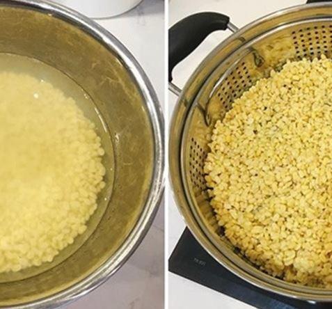 – Đậu xanh vo sạch, bỏ hạt hỏng, ngâm nước qua đêm cho đậu nở mềm. Hoặc có thể ngâm nước nóng khoảng 2 tiếng.