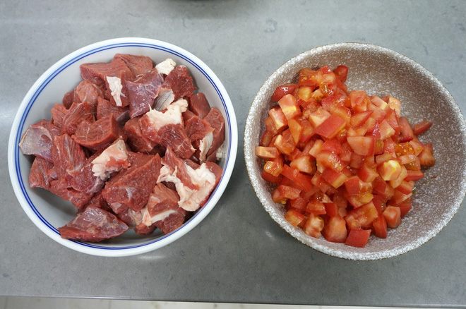 Thịt bò thái miếng to bản. Cà chua bỏ ruột, thái hạt lựu.