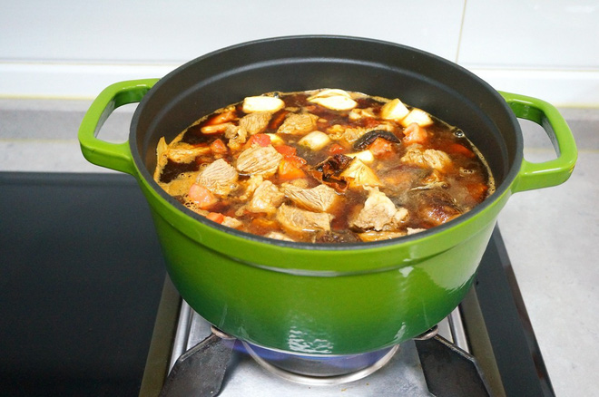 Cho tất cả nguyên liệu vào nồi đế dày, thêm nước nóng, muối, nước tương, sau đó đun sôi nồi canh rồi vặn nhỏ lửa. Thời gian ninh canh chừng 1 giờ, nếu muốn nhanh hơn bạn có thể cho vào nồi áp suất.