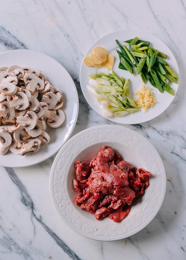 Ướp thịt trong 10 phút. Nấm thái lát mỏng. Tỏi băm nhỏ, hành thái khúc chéo, gừng thái lát.