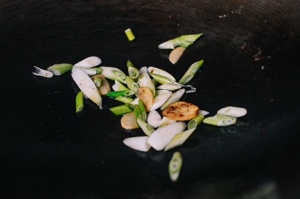 Vẫn dùng chảo đó, thêm chút dầu sau đấy cho hành trắng, gừng, tỏi vào đảo sơ lên.