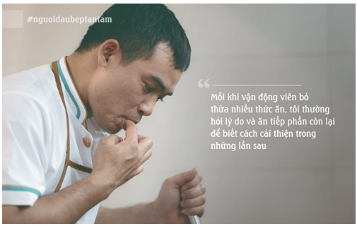 Mỗi khi thức ăn bị thừa nhiều, vị bếp trưởng thường hỏi các vận động viên, cán bộ trung tâm lý do và ăn tiếp phần thức ăn thừa để rút kinh nghiệm, nhằm cải thiện chất lượng cũng như khẩu vị trong lần sau. Khi còn nấu bếp tại các nhà hàng, Huy cũng thực hiện những công việc tương tự khi khách quen bỏ thừa nhiều đồ ăn đã gọi.