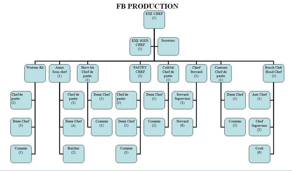 Tùy vào quy mô hoạt động mà có sự phân bố các chức danh trong bộ phận bếp phù hợp. Một bộ phận bếp đầy đủ thường sẽ bao gồm các chức danh sau: