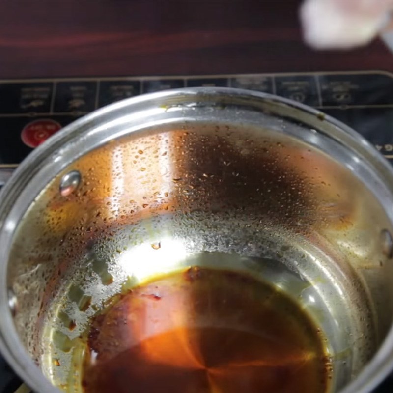 - Thắng nước đường: Bắc nồi lên bếp, chỉnh công suất lên 700W. Đổ vào nồi 1 muỗng cà phê đường, dùng đũa khuấy đều đến khi nước đường trở màu nâu cánh gián thì tắt bếp. Chờ đường nguội thì màu sẽ đậm hơn, đổ thêm 1 vá múc canh nước cho loãng bớt.