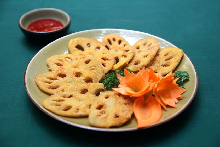 Mỗi rằm và mồng 1 âm lịch hàng tháng, Le Tonkin phục vụ thực khách buffet chay với những món ăn, thức uống cùng tiêu chí “sạch-sành-xanh”. Tiêu chí đồ ăn tại Le Tonkin là không giả mặn, chú trọng nguyên liệu sạch và không dùng mì chính, bột nêm. Trong ảnh là món ngó sen chiên ăn giòn giòn, lạ miệng và bổ dưỡng. Ảnh: Le Tonkin restaurant Hanoi.