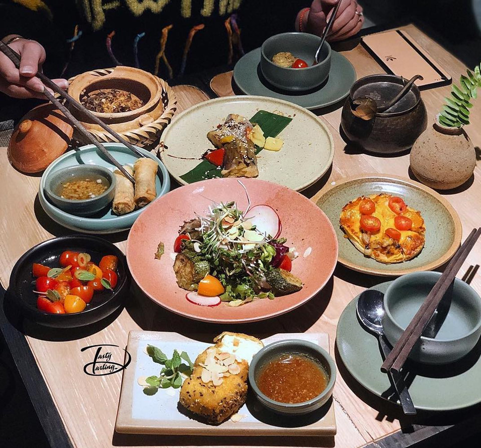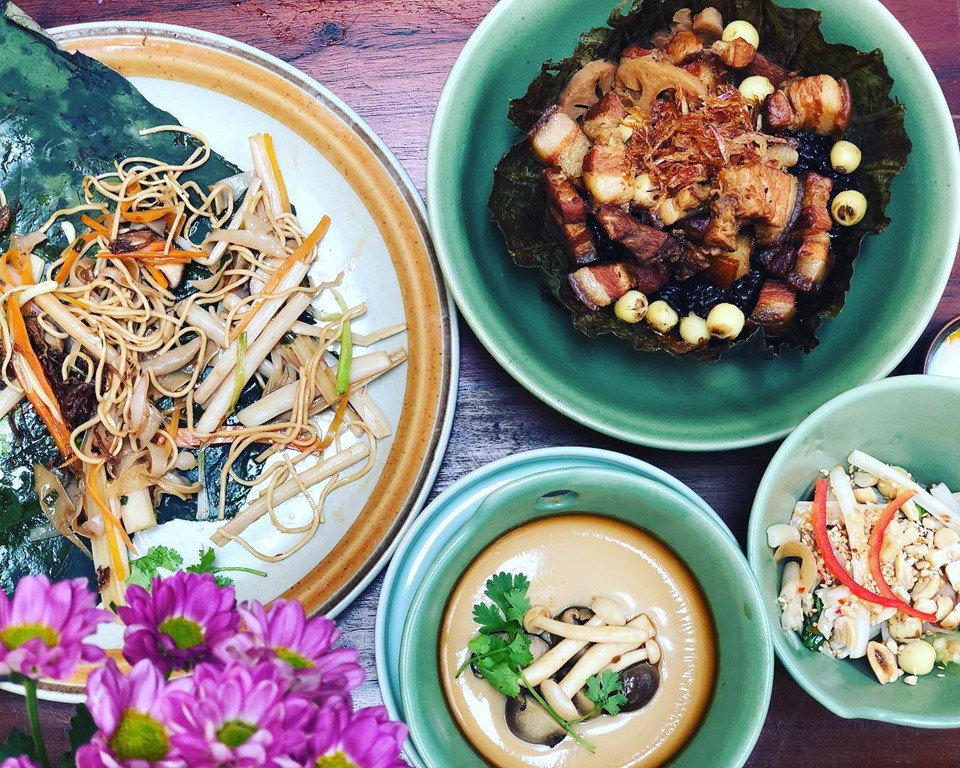 Những đầu bếp thiện tâm lành nghề sẽ đem đến cho thực khách ăn chay trải nghiệm về đồ ăn thực dưỡng, thuận với thiên nhiên. Quán không làm nhiều món giả mặn mà sử dụng những loại thực vật tươi mới nhất để làm nên món ăn thuần chay như nộm hoa chuối, nem nấm chiên, bún riêu chay. Ảnh: Le Tonkin restaurant Hanoi.