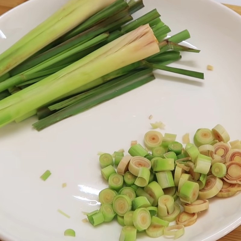 Sả cắt khúc dài khoảng 4 – 5cm và một phần đem băm sả khoảng 10gr. Hành tím thái lát và một phần băm nhỏ khoảng 10gr. Gừng cạo vỏ và thái lát. Ớt băm nhuyễn.
