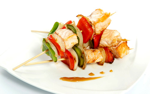 - Xiên xen kẽ cá hồi, ớt xanh, ớt đỏ và cần tây. Sau đó đem nướng hoặc áp chảo.