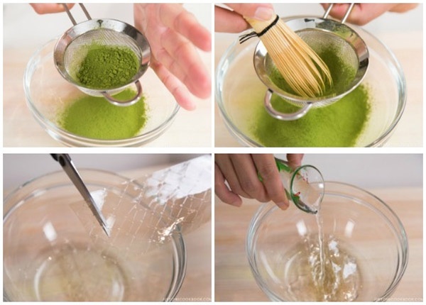 Rây bột trà xanh qua rây bột để pudding được mịn nhất.
