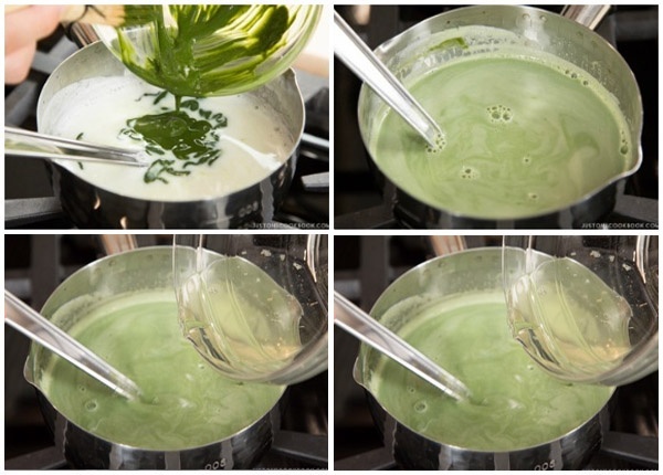 – Bước 2: Hòa bột trà xanh vào một ít nước, sau đó đổ vào hỗn hợp sữa ở bước 1 đang còn ấm, khuấy nhẹ tay cho bột trà xanh tan hết trong hỗn hợp. Thế là ta đã được hỗn hợp pudding trà xanh rồi đấy.