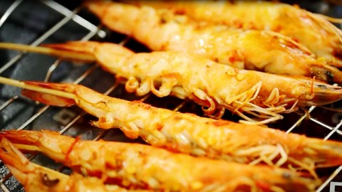 - Ướp tôm với ớt sa tế trong khoảng 20 phút sau đó xiên tôm qua que tre.
