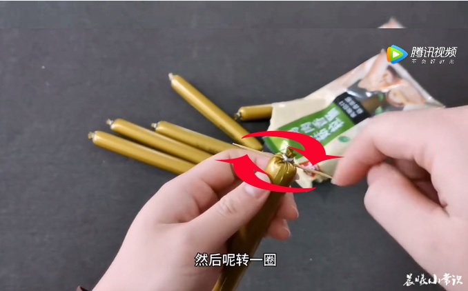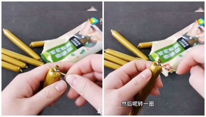 Sau đó, dùng tay vặn tăm theo chiều kim đồng hồ, phần nilon bọc thanh xúc xích sẽ tự động rách ra một cách nhẹ nhàng đơn giản.