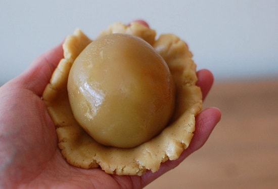 Phần đậu xanh bạn ve tròn thành viên lớn rồi bọc lại bằng lớp bột. Bước này cũng giống như khi chúng ta nặn bánh. Tiếp theo bạn cho bánh đã nặn vào khuôn để ép thành hình.