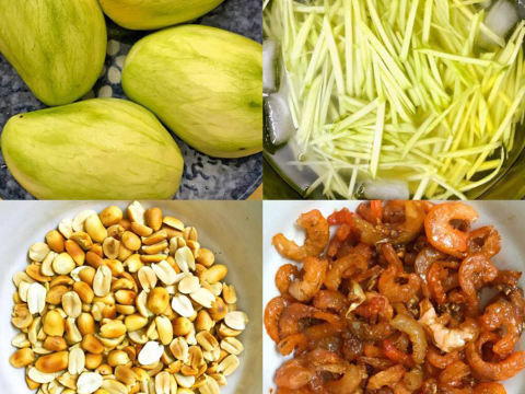 Đậu phộng rang chín, giã sơ qua. Xoài gọt vỏ, thái sợi hoặc bào sợi, ngâm ngay vào bát nước đá để giữ độ giòn cho xoài.