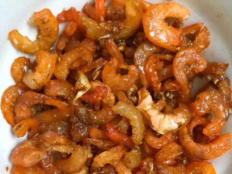 Băm chút hành tím và tỏi, cho dầu ăn vào chảo phi thơm hành tỏi, đổ tôm vào xào, thêm chút xíu đường và 1 muỗng cà phê nước mắm, xào chín bắc ra để nguội. Lưu ý tôm khô cũng có vị mặn rồi nên lựa cho ít nước mắm không lại bị mặn. Chú ý khi phi hành tỏi không để được vàng quá mà đắng khi hành tỏi hơi hanh vàng là phải cho tôm vào luôn.