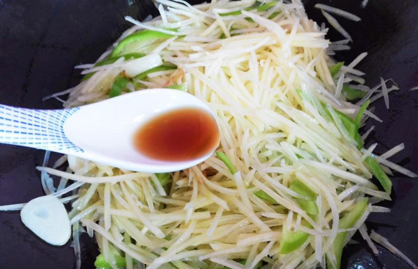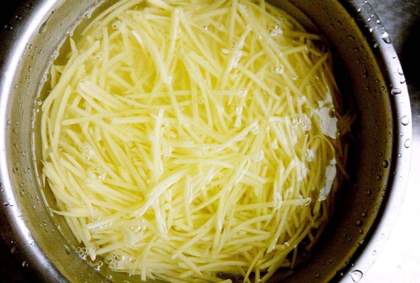 Tốt nhất, khoai tây sau khi gọt, thái sợi xong thì đem rửa sạch. Sau đó ngâm khoai trong nước lã một lúc để đảm bảo hết phần tinh bột thôi ra ở các mặt cắt của khoai. Như vậy khi xào, khoai sẽ không bị phần tinh bột này làm mềm, mất độ giòn.
