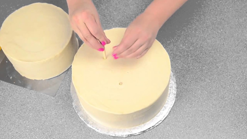 – Tiếp tục cắm từng que tăm theo cạnh của cốt bánh ở độ cao bằng với những que tăm vừa đánh dấu, vừa cắm vừa quan sát xem các que tăm đã ở độ cao bằng nhau chưa để điều chỉnh cho hợp lí, cắm càng nhiều que quanh cạnh bánh thì khi cắt càng khó bị lệch hơn.