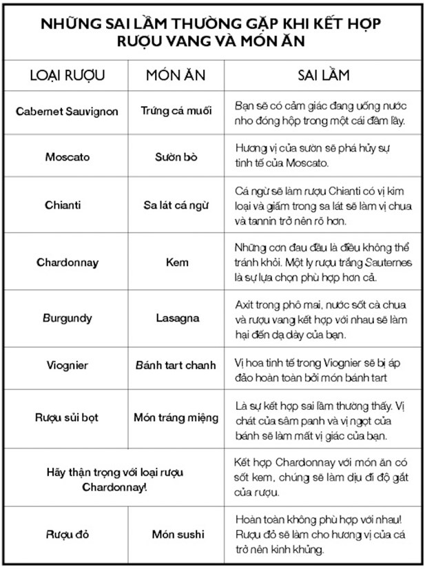 Có thể nói trong suốt chiều dài lịch sử, rượu vang đồng hành bên cạnh nền ẩm thực thế giới như hồng nhan tri kỷ. Không chỉ là chất xúc tác trên bàn tiệc, rượu vang còn làm cho món ăn thêm phần đặc sắc và cá tính hơn. Nếu như rượu vang trắng được ví như một ly nước chanh thanh tao thì vang đỏ được ví với ly cà phê sữa nồng nàn. Và từ đó những quy luật kết hợp cũng được hình thành. Nhưng quy luật quan trọng hơn tất cả chính là tin tưởng vào khẩu vị riêng của bạn và trải nghiệm nhiều hơn.