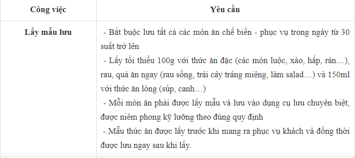 Mẫu thực phẩm (thức ăn) sẽ được lấy tại khu vực ra món trước khi mang ra phục vụ khách. Thời gian lưu mẫu thức ăn kéo dài ít nhất 24 tiếng kể từ khi lấy mẫu. Trường hợp có khách của nhà hàng nghi ngờ bị ngộ độc thực phẩm hoặc có yêu cầu cụ thể từ cơ quan quản lý thì không được hủy mẫu lưu và phải đợi thông báo khác.