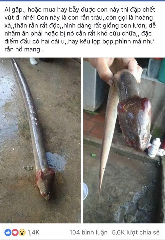 Trên trang facebook cá nhân, anh D. viết: “Ai gặp hoặc mua, bẫy được con này thì đập chết vứt đi. Con này là con rắn Tràu hay còn gọi là Hoàng xà, thân rắn rất độc, hình dáng rất giống con lươn, nếu ăn phải hoặc bị nó cắn sẽ rất khó chữa. Đặc điểm của con vật này là đầu có 2 cái u, hay kêu lọp bọp, phình má như rắn hổ mang”.