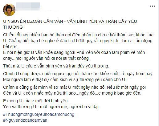 Chiều tối nay nhiều bạn bè thân gọi điện nhắn tin cho em hỏi thăm sức khỏe của U. Chẳng biết bạn bè nghe ở đâu tin U đột quỵ rất nguy kịch… làm em cảm động hết sức. Em nói hiện giờ U vẫn khỏe đang ngoài Phú Yên với đoàn làm phim về món chay… mọi người vẫn hỏi đi hỏi lại thật không.