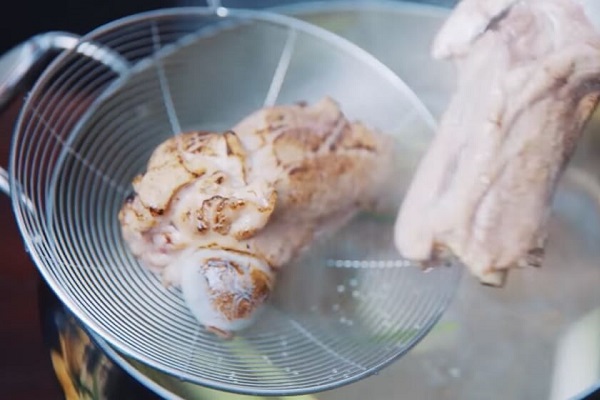 Đầu tiên, gừng, hành và tỏi thì cắt thành từng khúc nhỏ. Xương gà sau khi rửa sạch thì ngâm trong nước khoảng 30 phút để ra hết máu. Sau đó cho xương gà vào nồi nước đang sôi khoảng 20 giây rồi vớt ra rửa sạch lại bằng nước lạnh, kì sạch để loại bỏ phần máu còn sót lại.