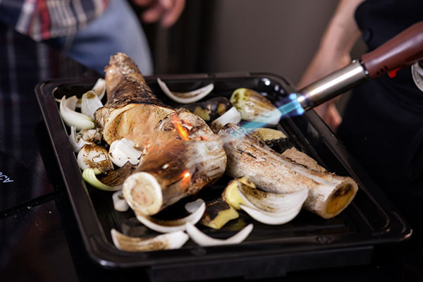 Cho xương vào khay nướng, nướng trong lò với nhiệt độ 200 độ C. nếu không có lò nướng, bạn vẫn có thể nướng trực tiếp trên lửa. Khi nào xương cháy hơi xém là được. Nước hầm sẽ có màu đậm hơn là nước hầm từ xương không nướng, hương thơm của nước hầm cũng sẽ nồng nàn hơn.