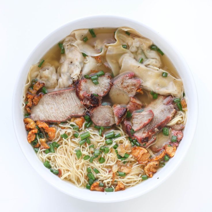 5. Add the noodles to the boiling water and cook for about 1 minute, until they are tender yet still have some bite. Drain the noodles and divide them among warmed soup bowls. Top the noodles with the sliced Lo Soi pork, dividing them evenly. Add the wontons to the simmering stock and cook for 3 to 5 minutes, until they float.